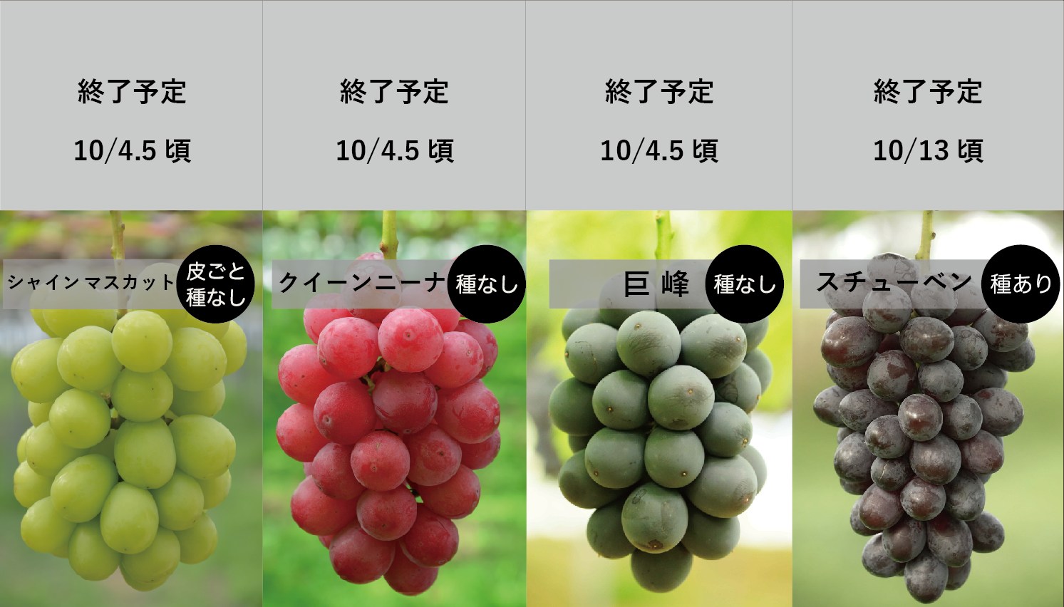 今シーズンの「シャインマスカット」の販売終了日についてお知らせいたします。